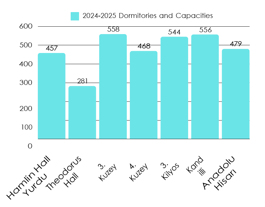 Room Type Dormitories: Hamlin Hall Dormitory, Theodorus Hall Dormitory and Anadolu Hisarı Dormitory are room type dormitories. In these dormitories, residence areas are organised as rooms. Dormitories have facilities such as wireless internet, 24-hour hot water, wooden furniture, bunk beds, wardrobes, tables, chairs, bookcases and refrigerators. Bathrooms and toilets are located on the floors and are shared by students.