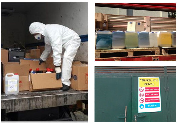 Chemicals with explosive, oxidising, flammable, irritating, corrosive, toxic, carcinogenic, mutagenic or ecotoxic properties are recorded and stored in the hazardous waste temporary storage area separately from other wastes in accordance with the Waste Management Regulation (OG: 02.04.2015-29314). These wastes classified according to waste codes are removed by licensed vehicles of industrial waste disposal facilities.