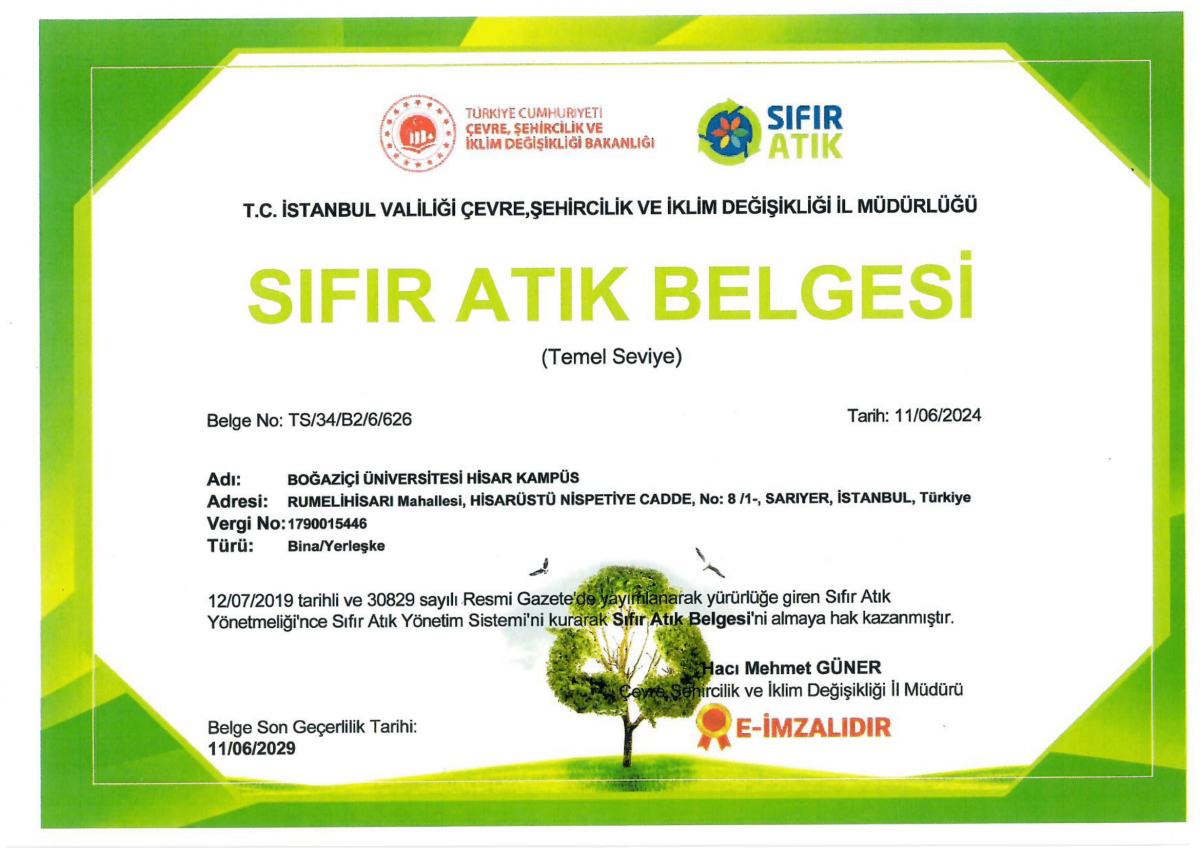 Boğaziçi University Hisar Campus Zero Waste Certificate (Dated 2024)
