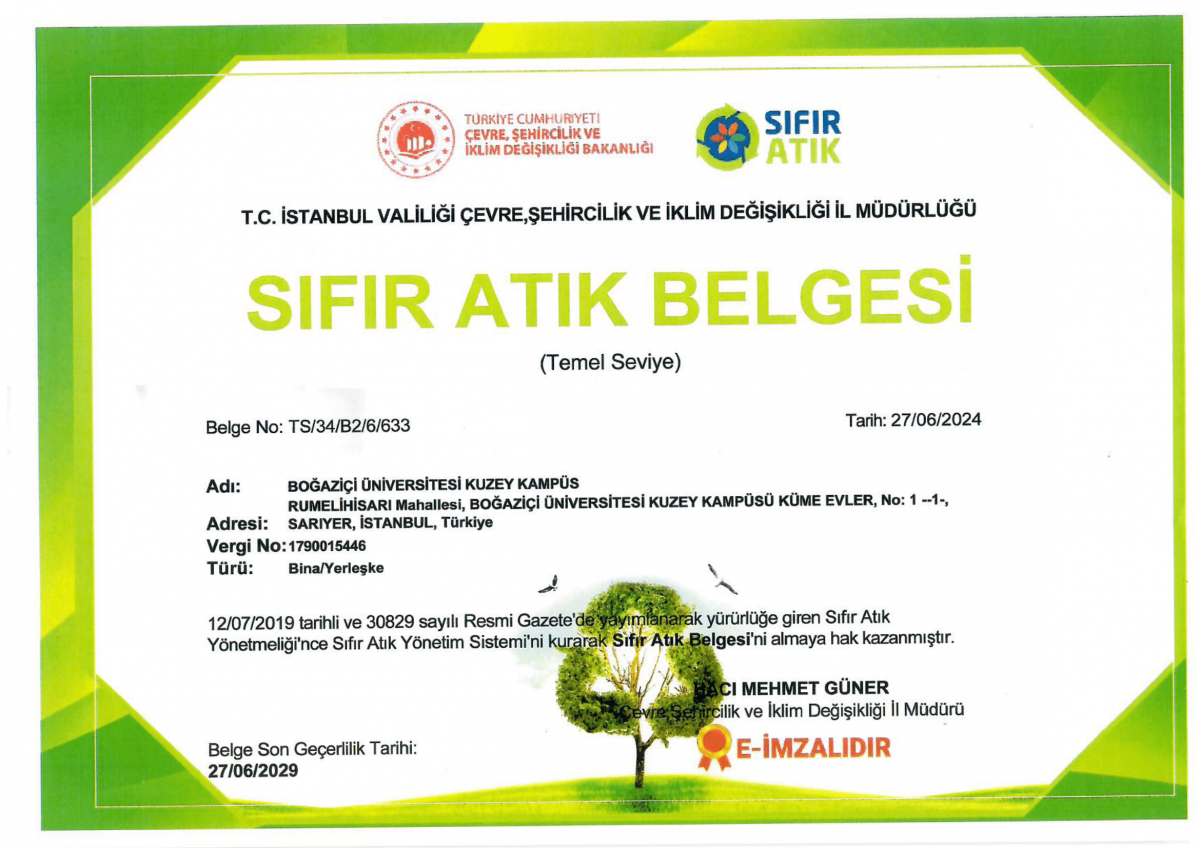 Boğaziçi University North Campus Zero Waste Certificate (Dated 2024)
