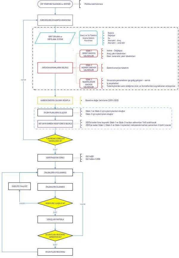 Boğaziçi University has prepared a comprehensive flowchart and action plans to achieve its net zero carbon emission target. Within the scope of the flowchart; a system was established to monitor electricity, natural gas, water and fuel consumption; three main emission sources were identified based on the collected data and action plans were developed for these focus areas. As a result of the action plans prepared for these three focal areas, it is aimed to reduce carbon emissions from buildings in Focus-1 and Focus-2 by 50% by 2030 and to eliminate carbon emissions in all focal areas by 2050.