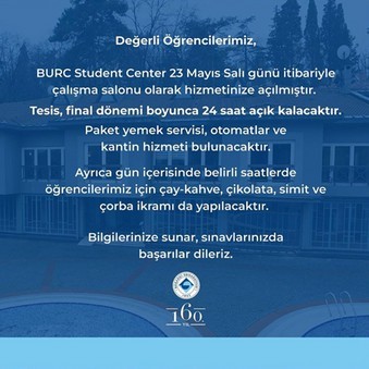 BURC Student Centre, which is located on an area of approximately 8 acres on the South Campus and has a closed area of 3,000 square metres, was opened as a study hall on 23 May 2023. This facility, which offers areas suitable for students' study and social activities, remains open 24 hours a day, especially during exam periods. In addition, tea, coffee, chocolate, bagel and soup are offered to all students free of charge at certain hours.
