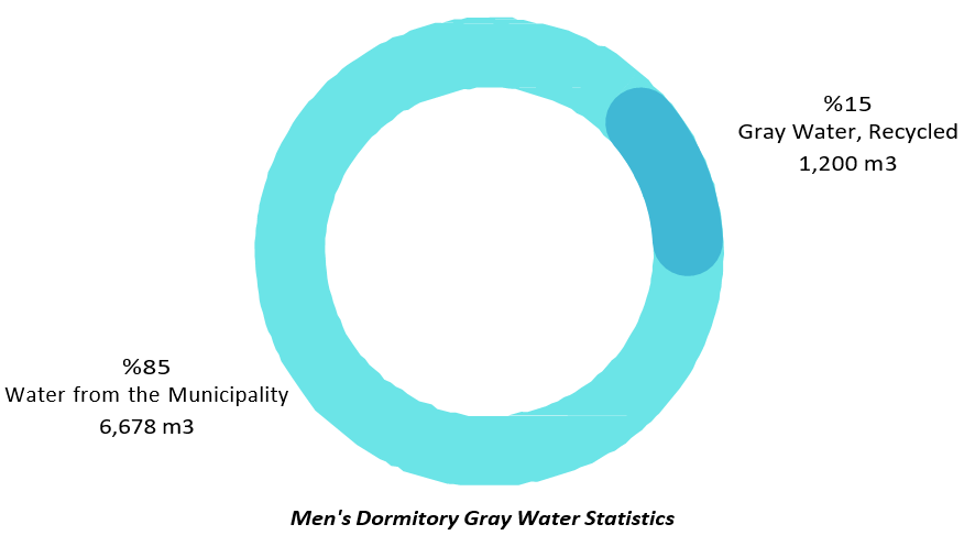 Gray Water Recovery Systems: With the gray water recovery systems used in Boğaziçi University's South Campus 1st Boys' Dormitory, North Campus 3rd Girls' Dormitory, North Campus 4th Boys' Dormitory and Kandilli Dormitory, 16 m³ of gray water is recovered daily in each building. This recycled water is used in toilet reservoirs, and in reservoirs with an average daily water demand of 6.5m3, all of this demand is met with recycled gray water. This practice corresponds to 15% of the total water consumption from the network for the 1st Men's Dormitory.